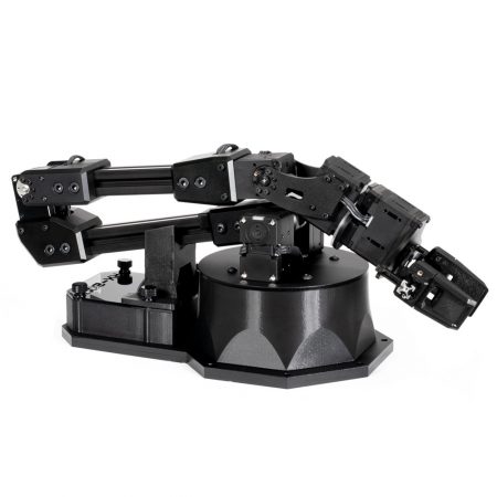 The ReactorX 200 comes fully assembled and tested and is constructed from extremely rigid 20mm x 20mm extruded aluminum and aluminum brackets. The arm sits on an industrial grade, slewing bearing for added stability and accuracy. The electronics are covered with a transparent acrylic shield to keep the electronics free from debris as well as with impact from the arm itself.