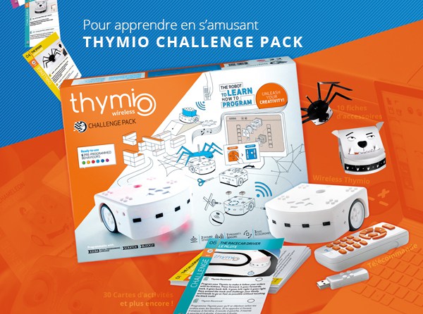 Thymio Challenge Pack is a small mobile robot which can be defined as well as an educational tool as a toy. Its goal is to allow general public to discover the fascinating worlds of robots and technology by programming it and by playing with its numerous functionalities. Thymio comes out of its box already assembled, you can discover it without losing one second!